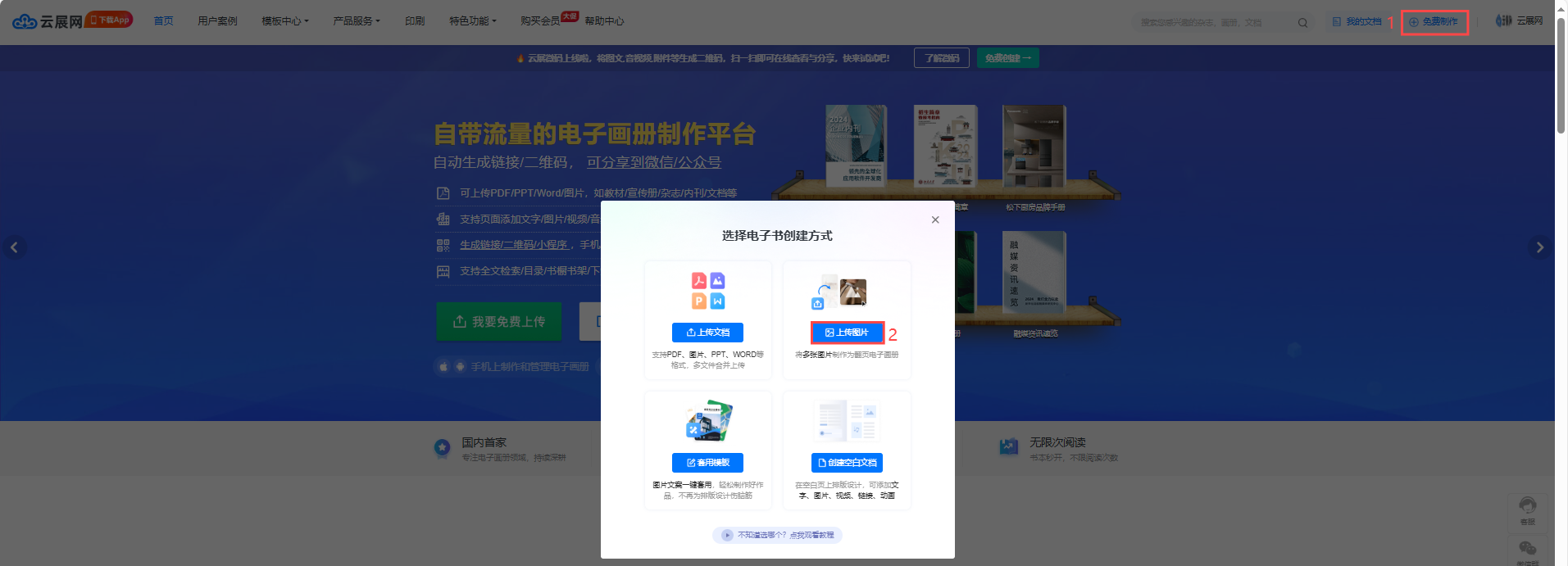 在云展網(wǎng)首頁(yè)的【免費(fèi)制作】,點(diǎn)擊【上傳圖片】,拖拽圖片或點(diǎn)擊【單文件上傳】/【多文件合并上傳】上傳你需要上傳的圖片后,可拖動(dòng)圖片以調(diào)整順序,并點(diǎn)擊【合并生成電子書】完成圖片上傳。