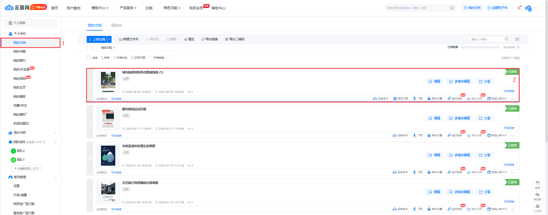 制作完成后的電子書將保存在【我的文檔】里,后續(xù)如果想重新編輯、管理的時(shí)候,可在【我的文檔】頁(yè)面對(duì)電子書進(jìn)行編輯、復(fù)制、刪除、設(shè)置等操作。