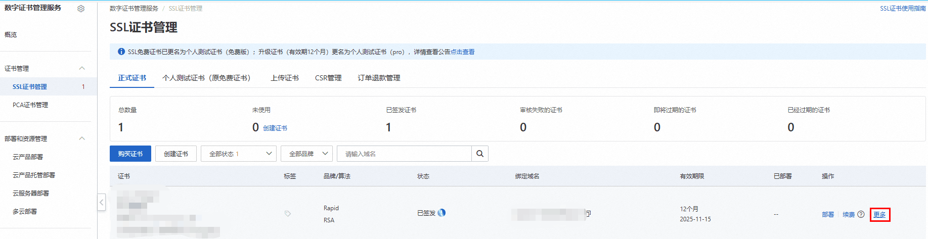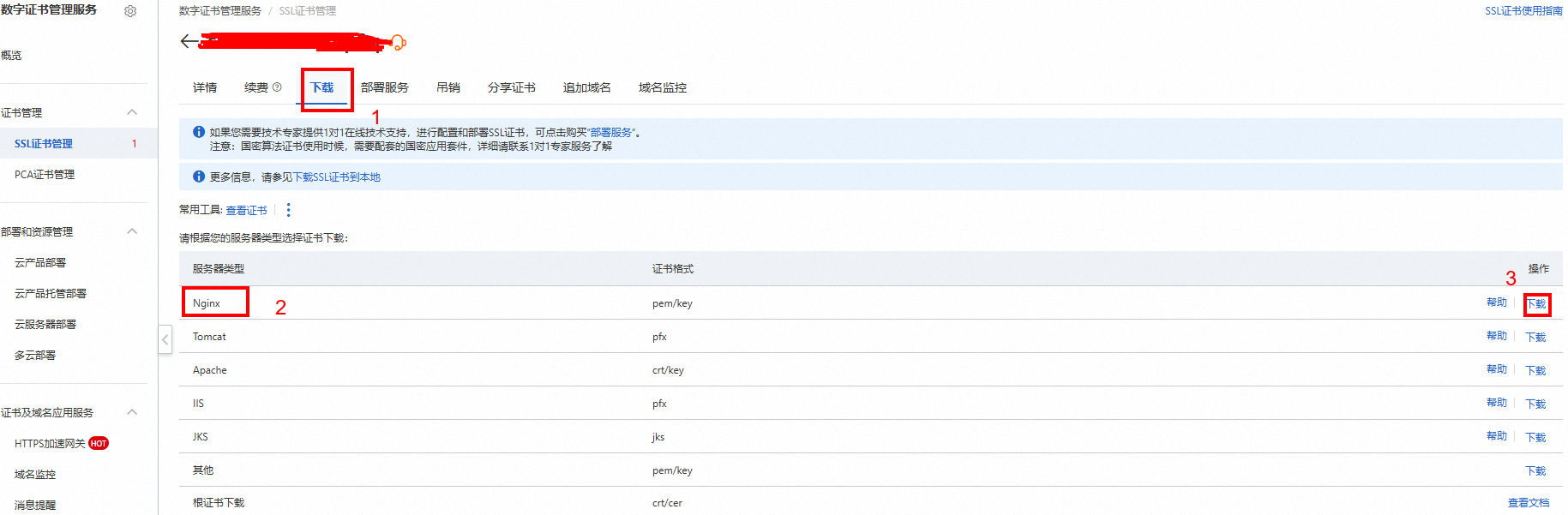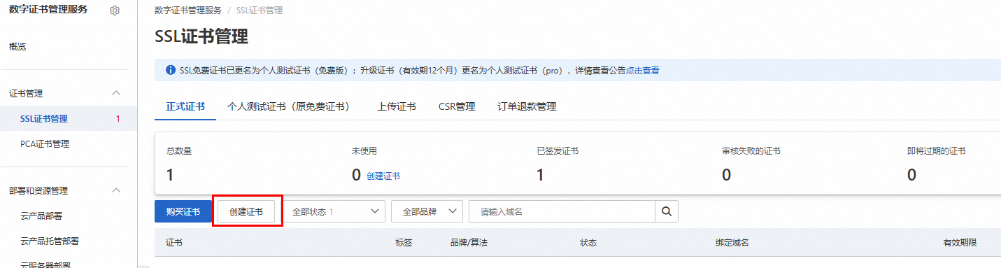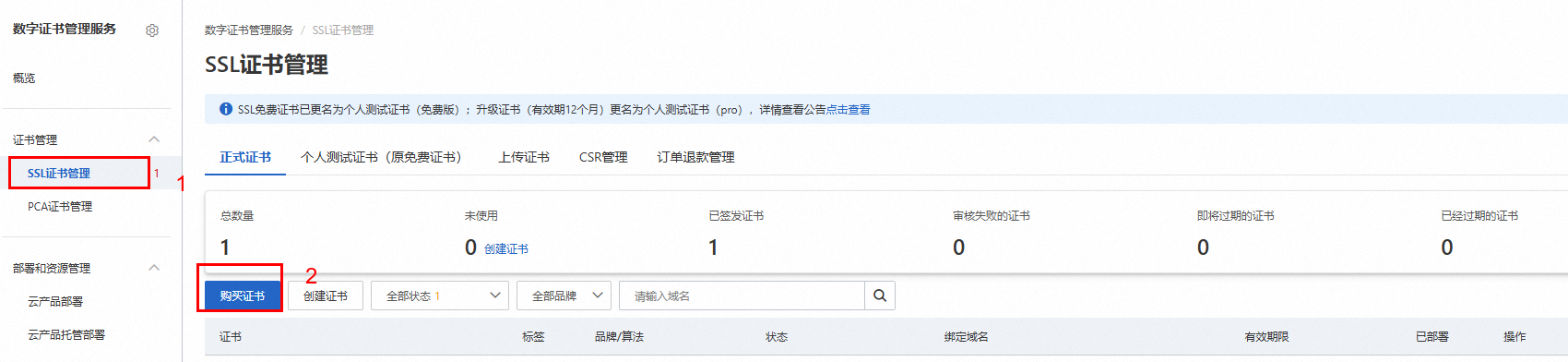 1)點擊左側欄的【SSL證書管理】,【購買證書】,如下圖: