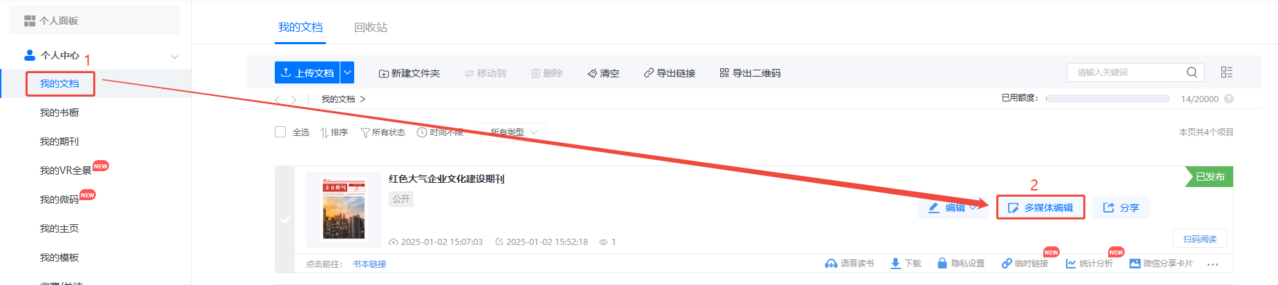 點(diǎn)進(jìn)【我的文檔】/【文檔】,選擇對應(yīng)電子書,點(diǎn)擊【多媒體編輯】/【內(nèi)容編輯】。