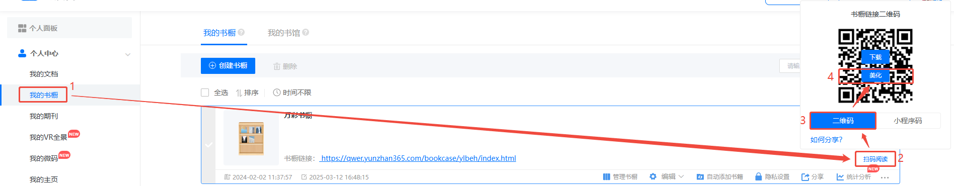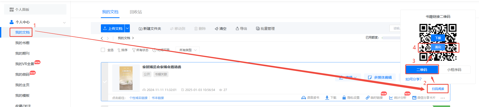 如果需要美化書本/書櫥的二維碼,點(diǎn)進(jìn)【我的文檔】/【我的書櫥】,鼠標(biāo)移動(dòng)到【掃碼閱讀】,選擇【二維碼】,鼠標(biāo)移動(dòng)到二維碼上點(diǎn)擊【美化】。