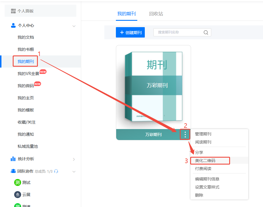 如果需要美化期刊集的二維碼,點(diǎn)進(jìn)【我的期刊】,點(diǎn)擊三個(gè)點(diǎn),選擇【美化二維碼】。