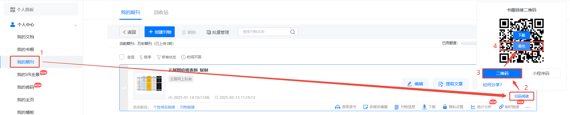 如果需要美化刊物的二維碼,點(diǎn)進(jìn)【我的期刊】,打開期刊集,鼠標(biāo)移動(dòng)到【掃碼閱讀】,選擇【二維碼】,鼠標(biāo)移動(dòng)到二維碼上點(diǎn)擊【美化】。
