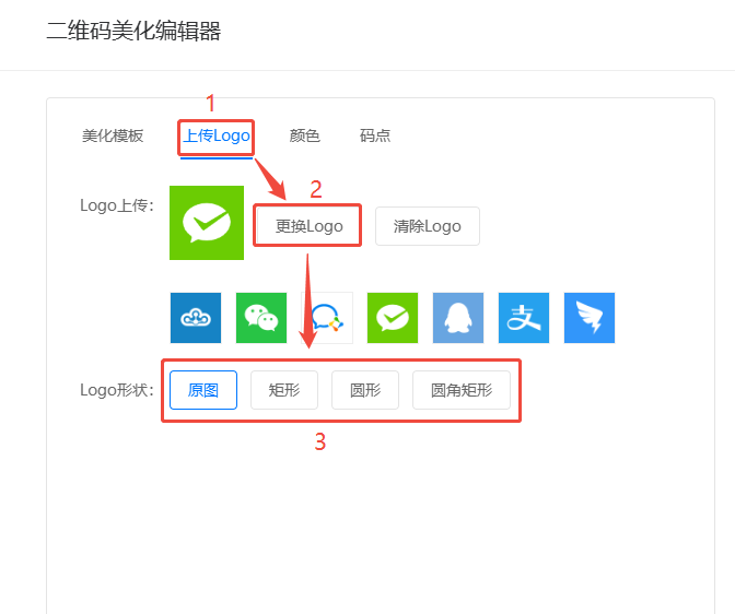 點(diǎn)擊【上傳logo】,再點(diǎn)擊【更換logo】上傳圖片,最后選擇【logo形狀】。