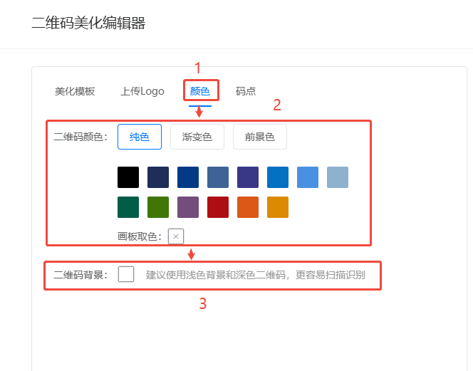 點(diǎn)擊【顏色】,下方設(shè)置二維碼顏色和二維碼背景色。