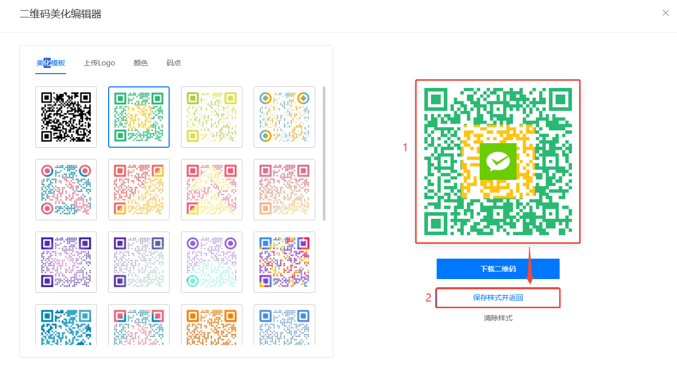 設(shè)置好之后在右側(cè)可預(yù)覽二維碼樣式,點(diǎn)擊【保存樣式并返回】即可保存。
