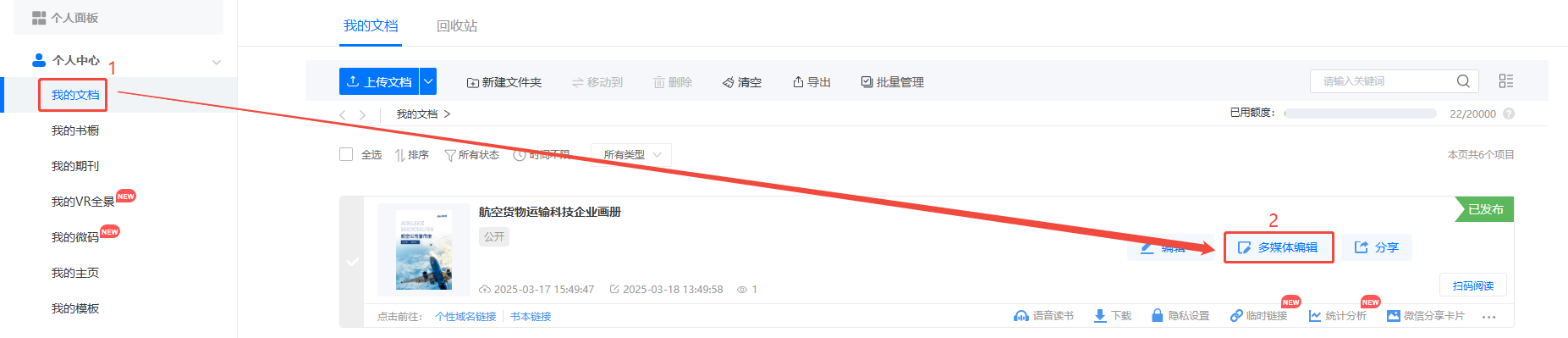 點進【我的文檔】/【文檔】,選擇對應電子書,點擊【多媒體編輯】/【內容編輯】。