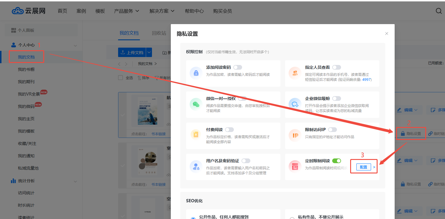 點(diǎn)擊【我的文檔】,再點(diǎn)擊【隱私設(shè)置】,開啟【定時(shí)限制閱讀】后,點(diǎn)擊【配置】。