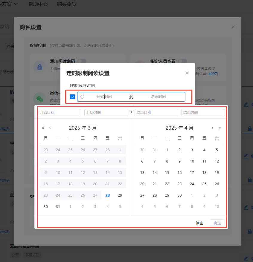 設(shè)置開啟日期時(shí)間和結(jié)束日期時(shí)間,在設(shè)置的這段時(shí)間內(nèi),書本可以正常閱讀。
