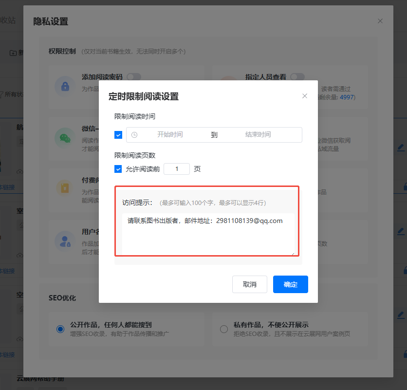 可根據(jù)你的需要,設(shè)置提示信息。比如你想讀者在無法閱讀的時(shí)候,能夠通過提示信息及時(shí)聯(lián)系到你,那你可在信息提示里輸入自己的郵箱地址。