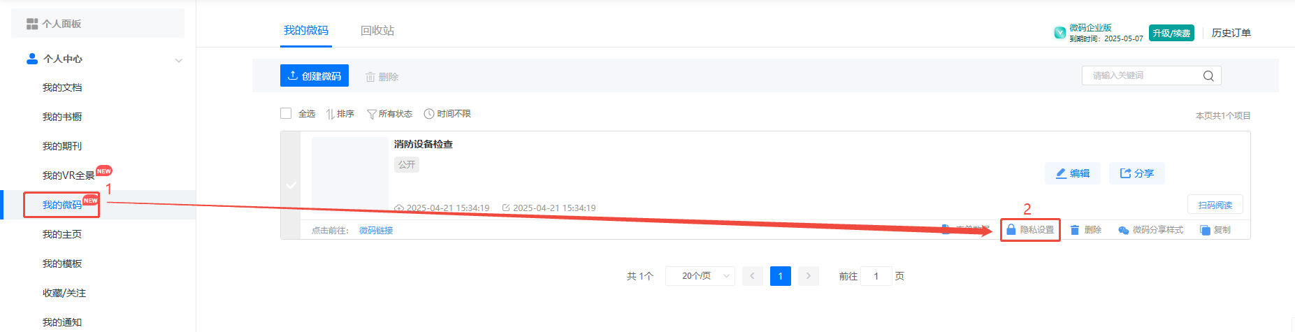 點(diǎn)擊【我的微碼】,選擇需要設(shè)置密碼的微碼,點(diǎn)擊【隱私設(shè)置】,打開【添加閱讀密碼】。