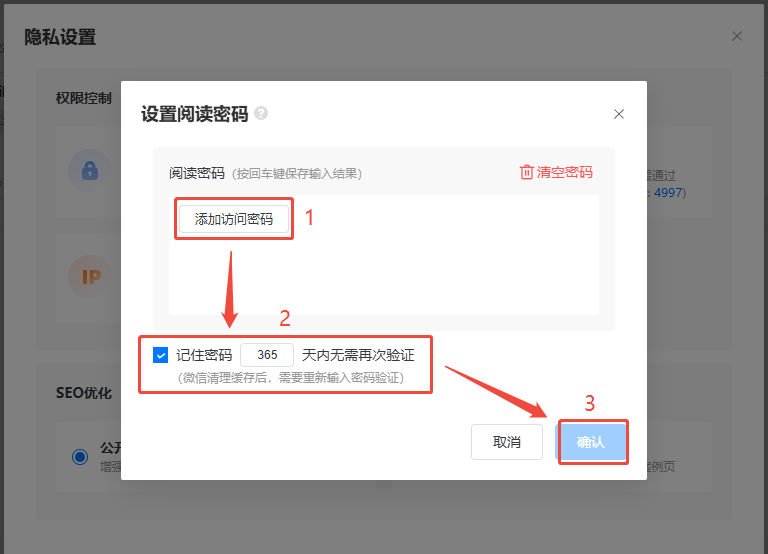 點(diǎn)擊【訪問(wèn)密碼】輸入一個(gè)或者多個(gè)密碼,如果您希望讀者在設(shè)定的時(shí)間段內(nèi)再次訪問(wèn)時(shí)無(wú)需重新輸入密碼驗(yàn)證,還可以選擇勾選下方的【記住密碼】,并設(shè)置密碼間隔時(shí)間,最后點(diǎn)擊【確認(rèn)】。