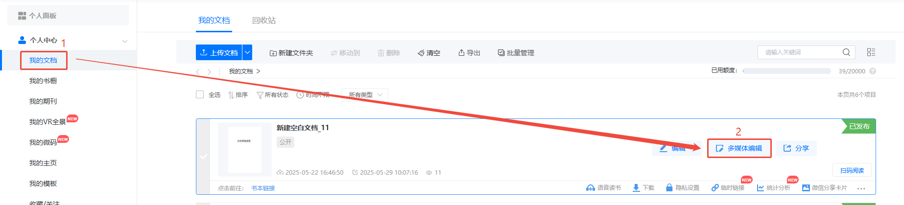 點進【我的文檔】/【文檔】,選擇對應電子書,點擊【多媒體編輯】/【內容編輯】。