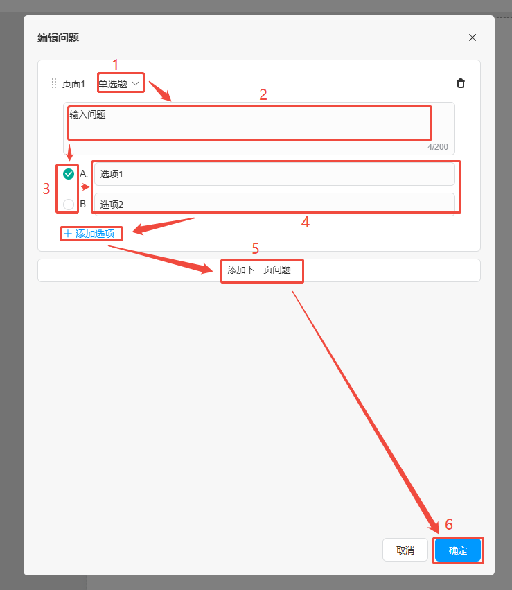 在【單選題】選擇題目為單選題或者多選題,下方輸入問題題目,勾選其中一個選項為正確答案(如果是多選題可勾選多個),右側編輯選項,如果想要增加多個選項,可以點擊【+添加選項】增加,如果需要添加多個問題,可以點擊【添加下一頁問題】,全都編輯好之后點擊【確定】。