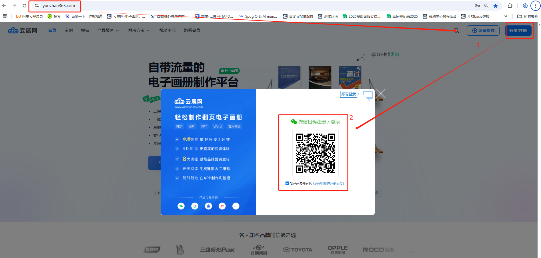 在電腦上打開瀏覽器,輸入網址http://www.tongyijxzz.cn/打開云展網,然后點擊右上角的【登錄/注冊】按鈕,用微信掃描二維碼登錄