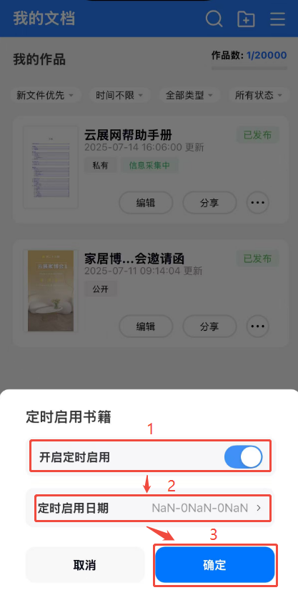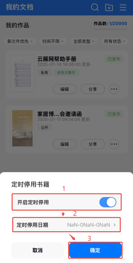 APP上如何設置書本定時啟用/停用功能? 一、功能介紹 如果你上傳的電子書需要在某個時間啟用,或者某個時間停用,可以使用啟用/停用功能進行設置,靈活控制電子書的可用性。 二、操作步驟 1、打開定時啟用/停用界面 點擊【作品】,點擊對應電子書右邊的三個點,然后根據需要點擊【定時啟用】或者【定時停用】,打開界面。 2、設定啟用/停用日期 打開【開啟定時啟用】或者【開啟定時停用】,并選擇啟用日期或者停用日期,點擊確定即可。