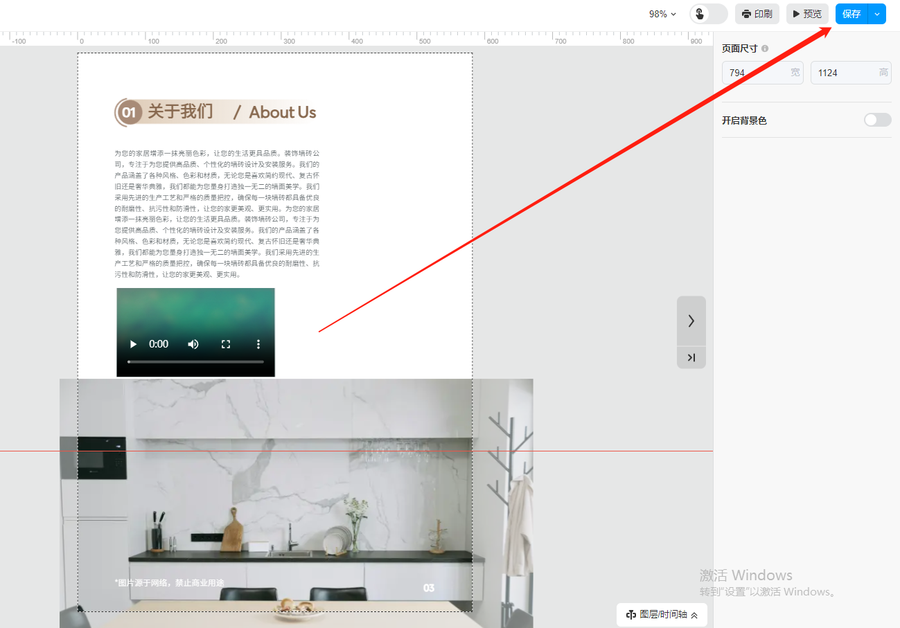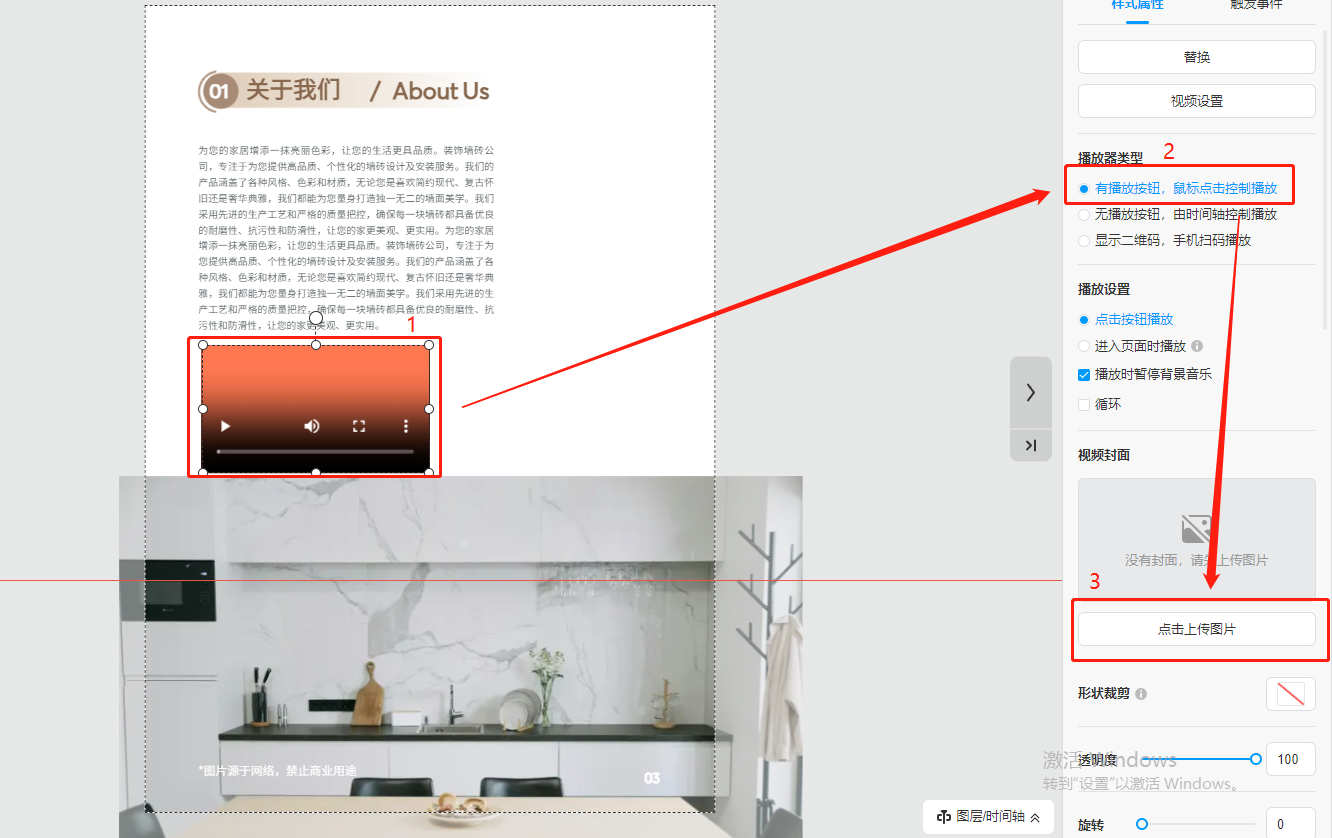 如何設置視頻封面? 一、功能介紹 這個功能可以給插入的視頻添加封面,使其看起來更美觀。 二、操作步驟 1、打開多媒體編輯器 點進【我的文檔】/【文檔】,選擇對應電子書,點擊【多媒體編輯】/【內容編輯】。 2、設置視頻封面 選擇頁面上的視頻,類型選擇【有播放按鈕,鼠標點擊控制播放】,然后點擊【點擊上傳圖片】,選擇電腦上的圖片即可。 注意:只有視頻類型為【有播放按鈕,鼠標點擊控制播放】,才可設置視頻封面。 相關教程:查看如何添加視頻 3、保存 設置好后點擊右上角保存。