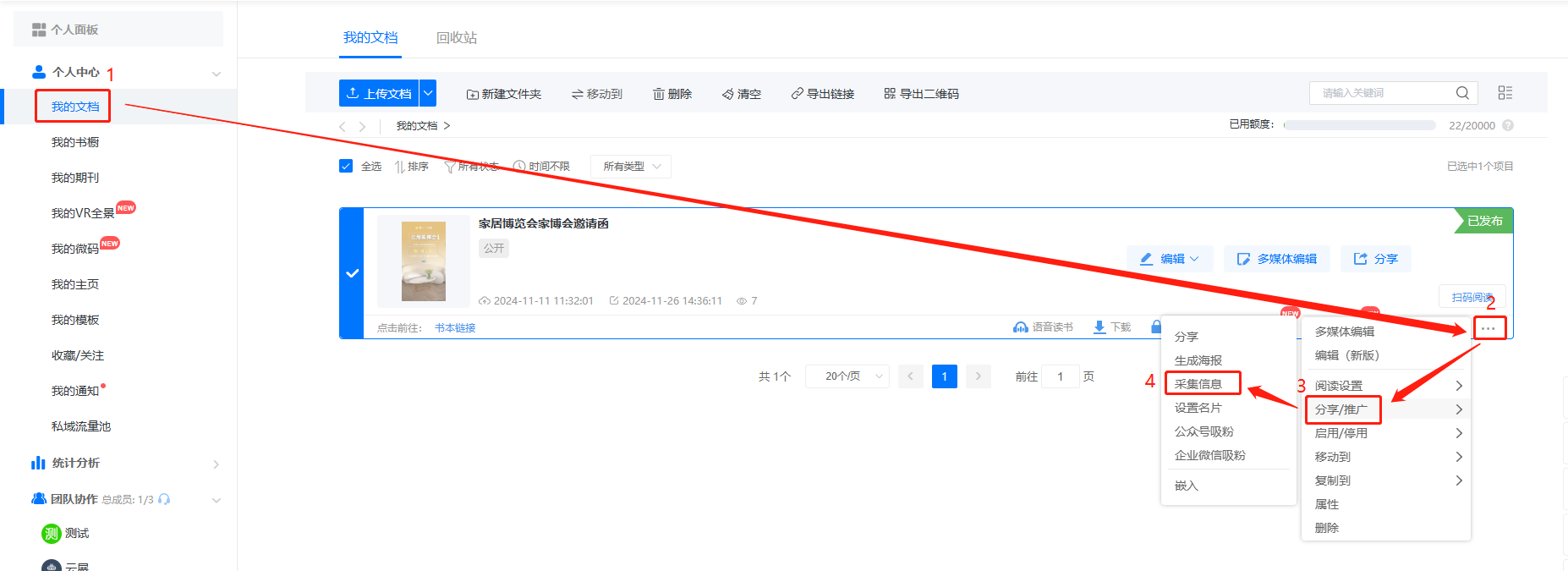 點擊【我的文檔】/【我的書櫥】,找到書本/書櫥,點擊右下角三個點,點擊【采集信息】。