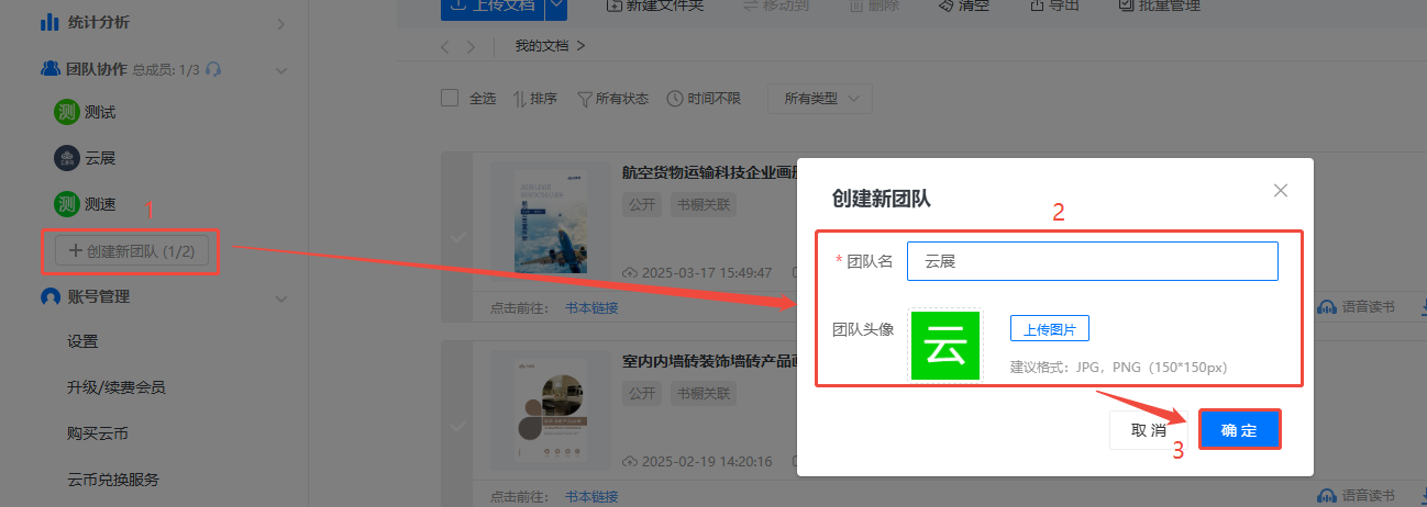點擊【創建新團隊】,輸入團隊名以及上傳團隊頭像后點擊【確定】,即為創建成功。