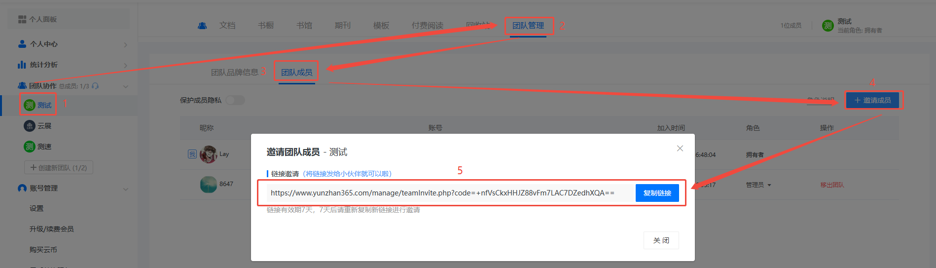 點進創建的團隊,點擊【團隊管理】,然后點擊【團隊成員】,再點擊【邀請成員】,會有一個邀請鏈接,復制后發給好友,好友點擊鏈接進去即可申請加入團隊。