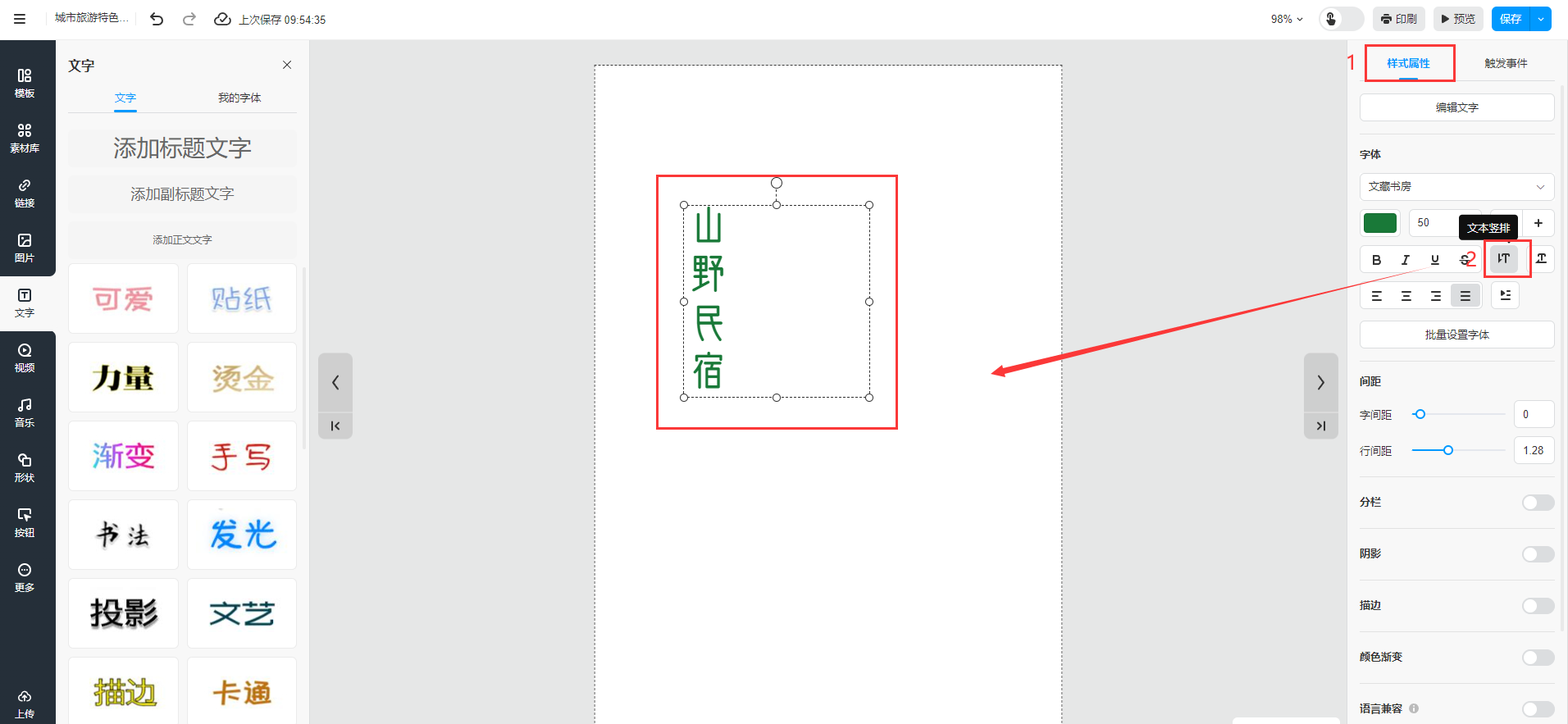 選中文本內容進入【樣式屬性】,點擊【文本豎排】即完成。