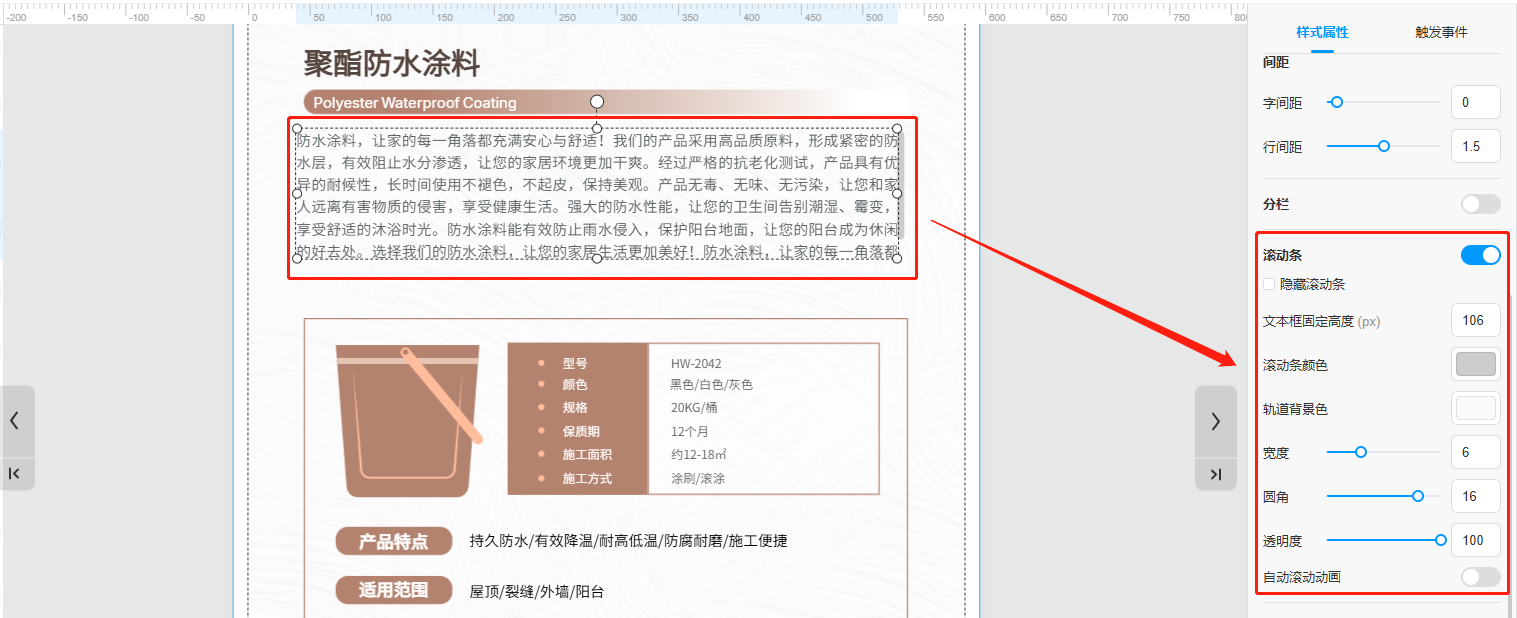 當文字段落太長,又不想它占據頁面太多面積時,可以選中文本框并打開【滾動條】,這樣可以縮小文本框的面積,讀者可以滑動觀看后面的內容。