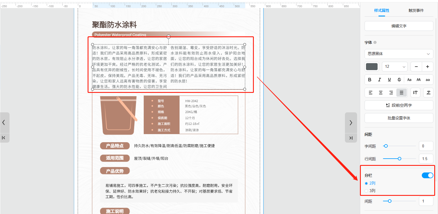 選中你所需要修改的文本框,打開【分欄】,文字段落會自動分成對應數量的欄目。