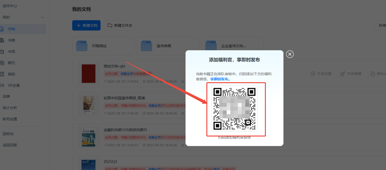 (2)點擊【文檔】找到正在審核中的電子書,鼠標移動到藍色字體【添加微信】會顯示出微信二維碼,掃碼添加即可。