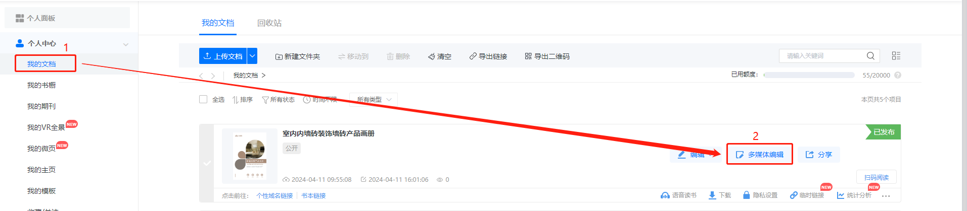 點進【我的文檔】/【文檔】,選擇對應電子書,點擊【多媒體編輯】/【內容編輯】。