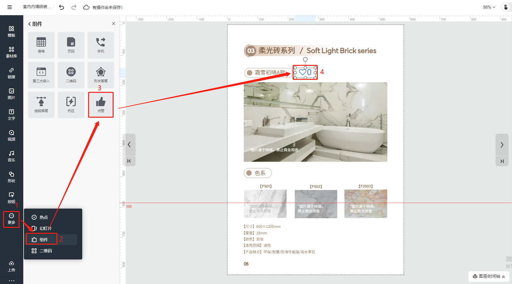 點擊【更多】,然后選擇【組件】,再點擊【點贊】,在頁面中會出現一個點贊按鈕,點擊可拖動調整位置。