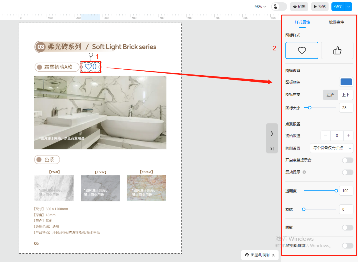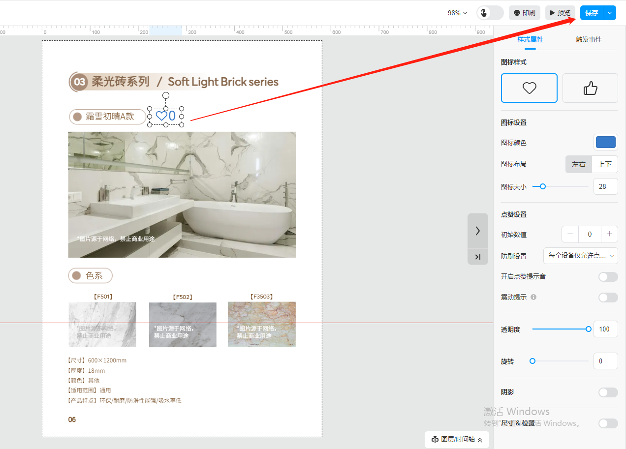 選中頁面上的點贊按鈕,設置點贊的樣式、透明度、位置和大小、旋轉。