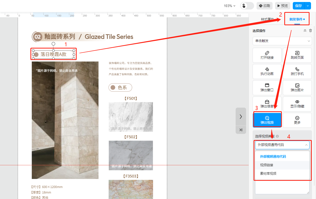 選中需要彈出視頻的文字或者圖片,然后在【觸發事件】選擇【彈出視頻】,選擇視頻類型。
