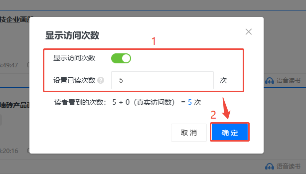 打開【顯示訪問次數】,設置已讀次數后點擊確定,書本上顯示的最終數值為:填寫的數值+真實的訪問次數。