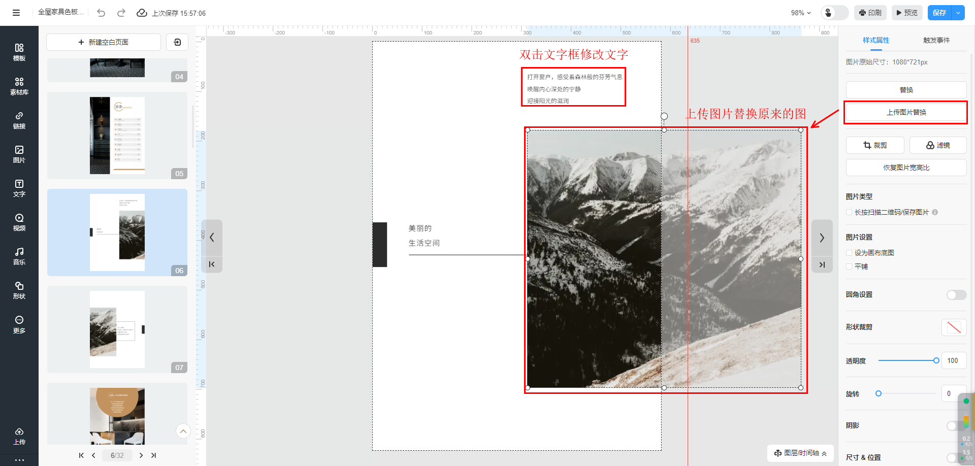 雙擊文字或者圖片框,對(duì)文字進(jìn)行修改或者替換圖片。