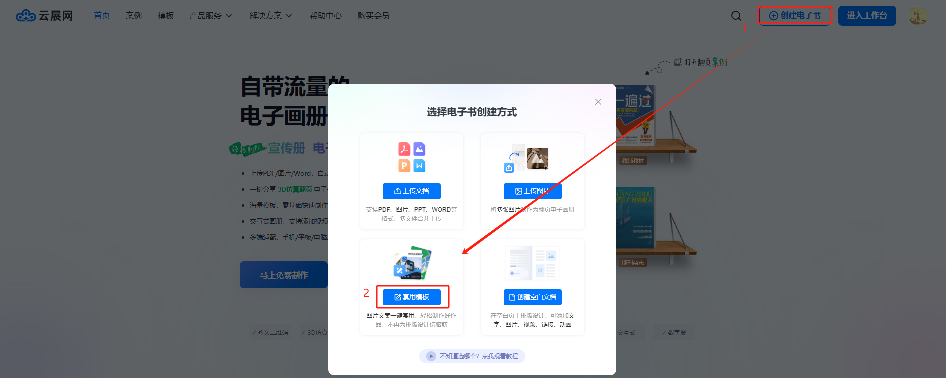 點(diǎn)擊右上角【創(chuàng)建電子書】,然后點(diǎn)擊【套用模板】,進(jìn)入模板中心。