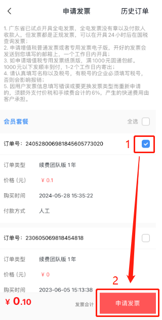 勾選需要申請發票的訂單,然后點擊【申請發票】。