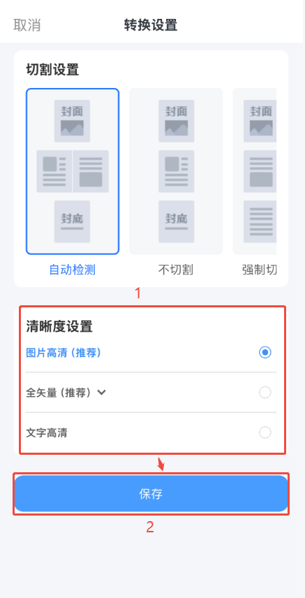 文字高清:如果上傳的是純文字的文件,可以選擇文字高清,但可能會出現文字缺失的問題,建議還是選擇圖片高清。