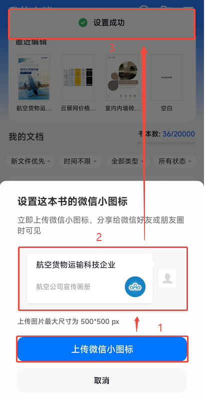 (2)點(diǎn)擊【上傳微信小圖標(biāo)】,選擇手機(jī)里的圖片文件,支持上傳JPG/PNG/JPEG格式的圖片,推薦尺寸是200x200px,最大尺寸是500x500px,上傳成功后最上方會(huì)顯示設(shè)置成功,中間可以預(yù)覽分享到微信上的樣式。