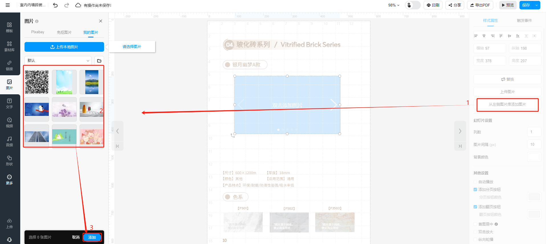 點擊【從左側(cè)圖片庫添加圖片】,在左側(cè)的圖片庫選擇圖片后,點擊【添加】,將圖片添加到幻燈片中