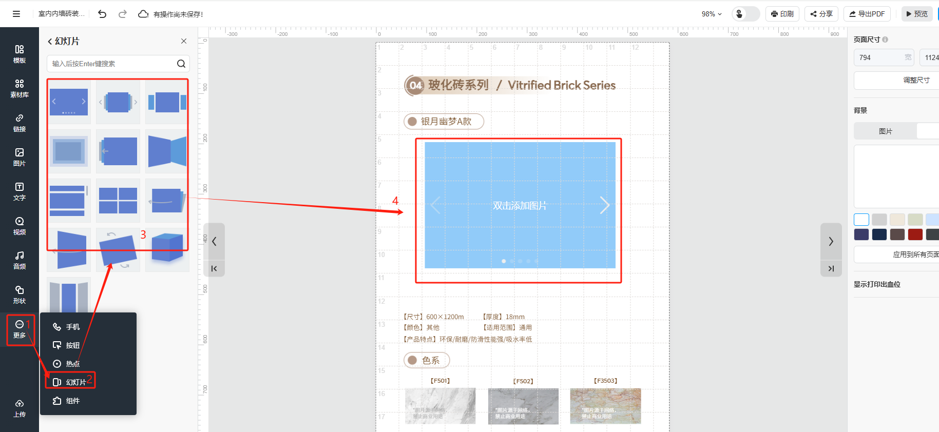 點擊【更多】,選擇【幻燈片】,挑選一個幻燈片的樣式,頁面會出現(xiàn)一個幻燈片組件