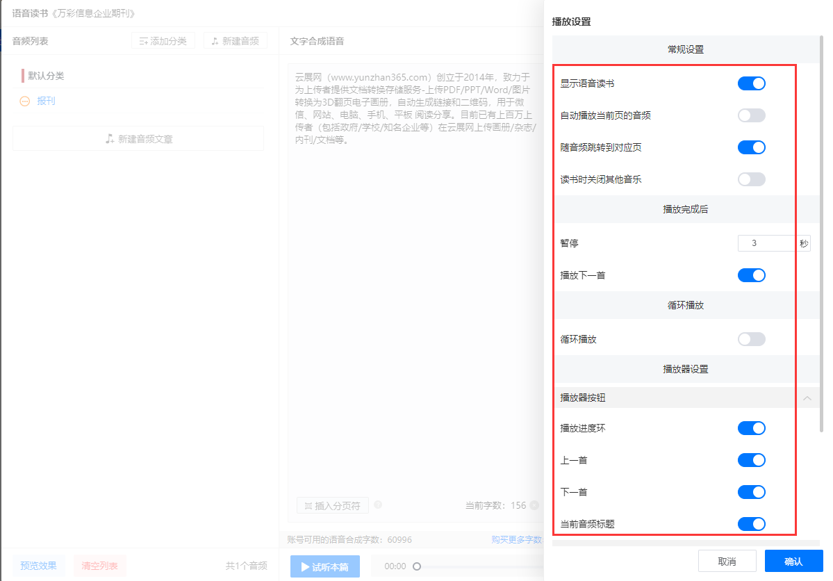 語(yǔ)音讀書的播放設(shè)置,支持自定義設(shè)置語(yǔ)音播放器的logo,播放器樣式等,設(shè)置個(gè)性化的語(yǔ)音閱讀模式體驗(yàn)。