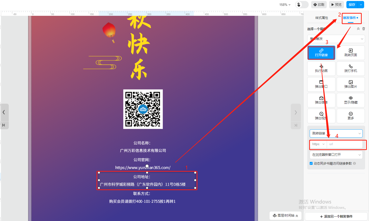 選中鏈接框,點擊【觸發事件】,然后選擇【打開鏈接】,下方輸入地圖目的地鏈接。