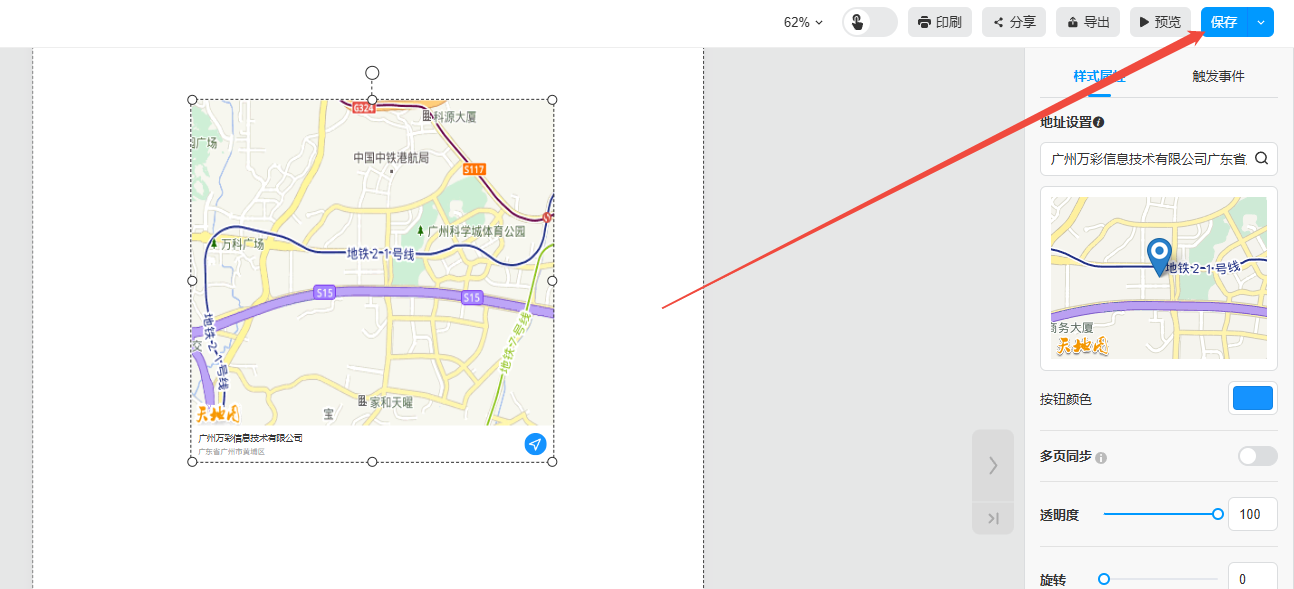 點擊【更多】,選擇【組件】,然后點擊【地圖】,在頁面上就會出現一個地圖板塊,在右側【地址設置】輸入目的地,設置【按鈕顏色】即可。