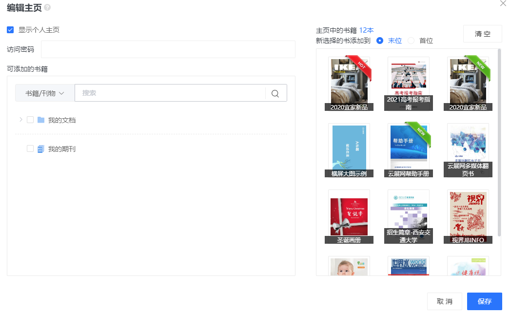 2、彈出編輯窗口后,點(diǎn)擊文件夾,勾選需要展示的書籍并保存,設(shè)置私有的雜志將不會(huì)展示在主頁(yè)。