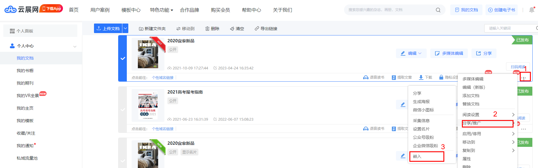 1、在我的文檔,更多,分享/推廣,找到嵌入