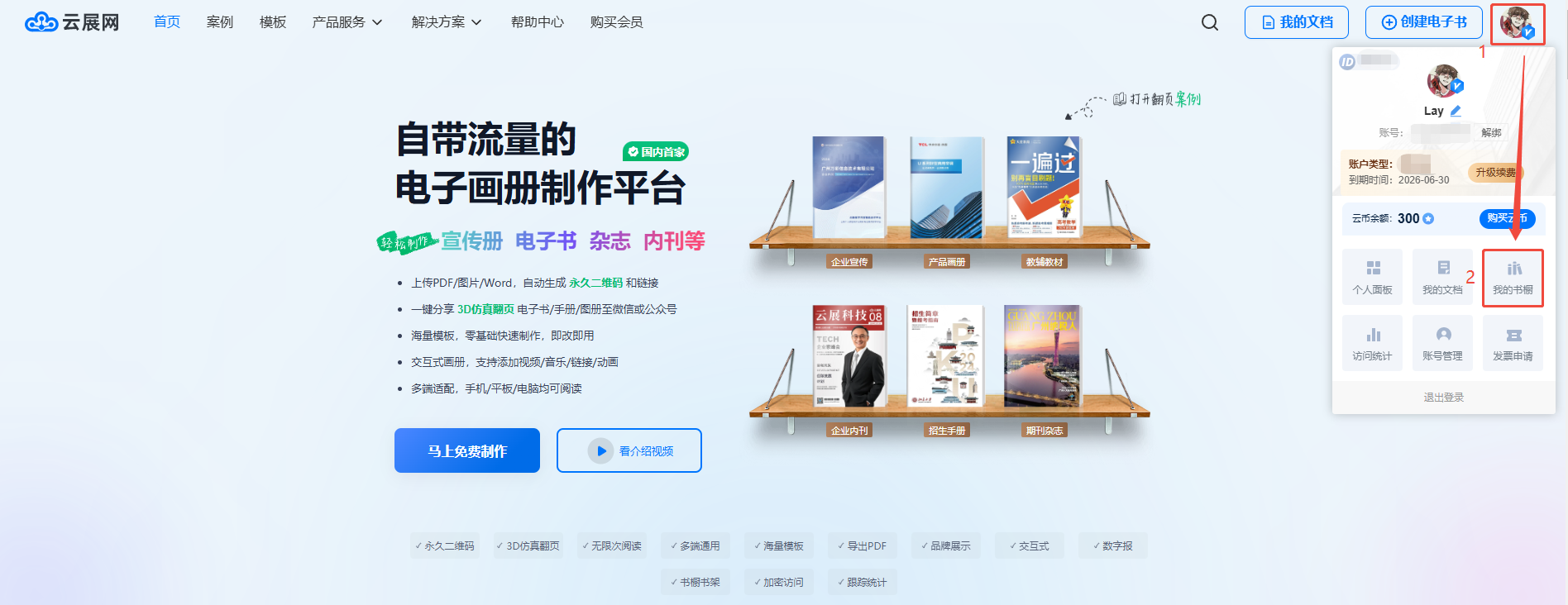 將鼠標懸停在云展網首頁右上角我的賬號上,點擊【我的書櫥】進入界面。