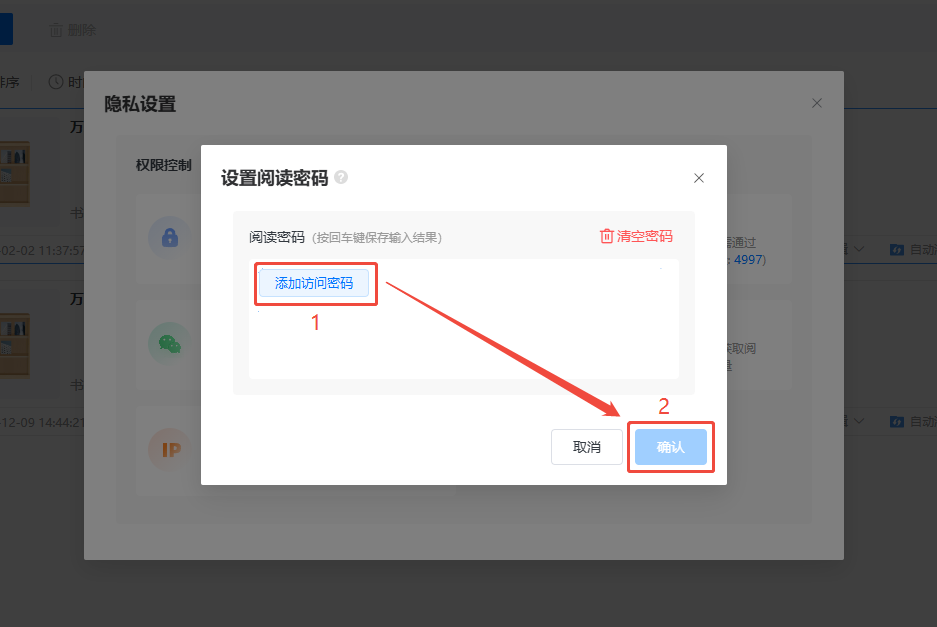 勾選【添加閱讀密碼】彈出彈窗,點擊【添加訪問密碼】輸入密碼后點擊【確定】即可。