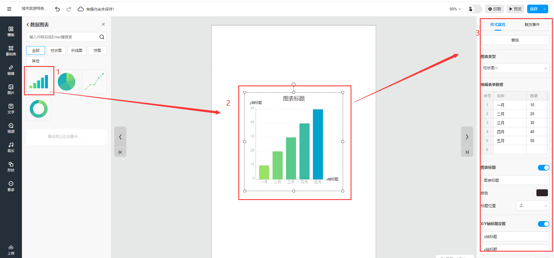 在添加數據圖表后,你可以更改圖表的標題名稱和位置、數據以及顏色等。