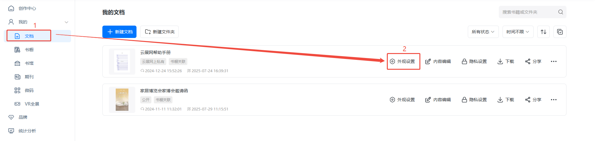 點擊【我的文檔】/【文檔】,然后點擊對應電子書的【編輯】/【外觀設置】,進入編輯器界面。