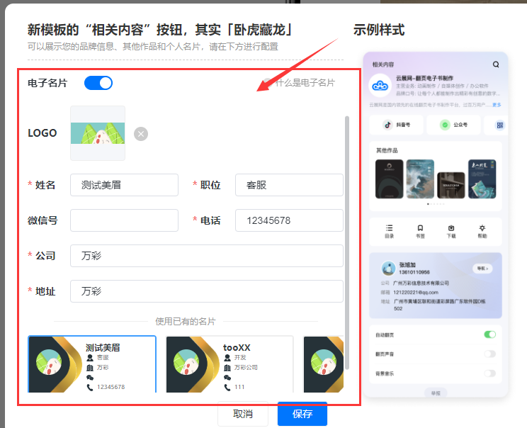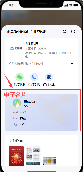 電子名片是指添加您的logo圖、姓名、職位、微信號,電話等信息形成電子名片,展示在相關內(nèi)容面板上,可以快速地與潛在客戶建立聯(lián)系,提高溝通效率和響應速度。